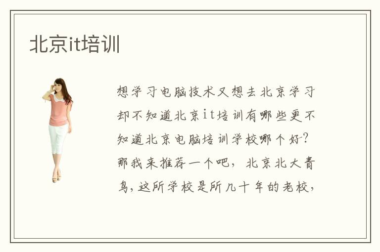 想学习电脑技术又想去北京学习却不知道北京it培训有哪些更不知道北京电脑培训学校哪个好?那我来推荐一个吧,北京北大青鸟,这所学校是所几十年的老校,在北京it培训排名中它最靠前,这所学校教学课程全面覆盖,不同的校区有着不同的教学理念,和不同的教学氛围,学生可在学习过程中相互穿插体验,就业之前会有相关的就业指导教师对你一对一的指导因此获得好多家长的称赞,有好多企业也是很认可这所学校,自建校以来往社会输送的人才5万余人,这是北京it培训最成功的案列,如果你认为学习电脑技术特别的枯燥那就来北京电脑培训学校进行学习,北京的电脑学校教学模式都是非常有趣的,当你对电脑技术有了兴趣你才会好好去学习,将来工作上面也会顺风顺水,成为这方面的人才说话也会有底气,北京it培训会实现你的梦想。2018最火热的行业当属计算机行业,计算机方面的工作人员不但工资待遇高还总是令人羡慕,什么大数据、什么微软、给人听起来就高大上,所以要想学技术就得迎合当今社会最看中的技术,而计算机技术去哪里学最好?当然是祖国的首都北京啦,北京it培训在计算机技术方面是最专业的。在这个电子产品畅行的时代你再不学习就会落后的,学习it技术会让你的工作升职加薪不再是梦想。了解北京计算机培训计算机培训机构也是给自己个机会,一个月薪7000,8000的机北京it培训如何会。不要总是羡慕别人,为什么一样的工作你的工资最低?就是因为你没有过硬的技术,你的同事同学都在学习计算机知识而你却不以为然,所以机会都是给有准备的人的。要不然你这辈子就只能拿着这点死工资度日了。众所周知当今社会最稀缺的人才就属计算机专业的人才,计算机专业有it、it、大数据计算,这些技术看起来感觉好难学的样子,所以现在很多年轻人都在报计算机培训班,这样有了专业的老师指导学习起来就简单多了,学习计算机技术就是为了与时俱进,而北京it培训都很不错,在北京交通发达,接触的人和事都是不一样的,北京的计算机培训班教学水平都是非常之高的,与其你自己在家学习不如去培训班,叫上同事朋友一起报个培训班学习一门技术,培养一些兴趣开开心心的学习计算机技术,把自己不会的领域补充一下,再想升职加薪不是问题,毕竟现在的工作都离不开电脑,所以计算机技术是很实用的,当你有了一门最受欢迎的技术你会发现你的人生从此开了挂。