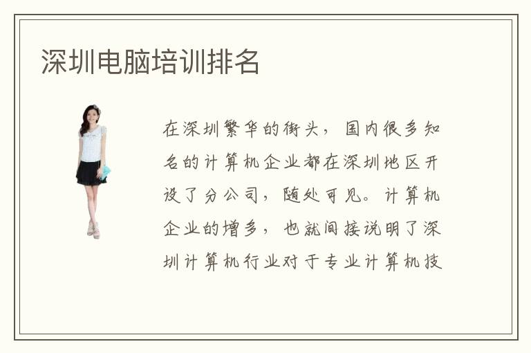在深圳繁华的街头,国内很多知名的计算机企业都在深圳地区开设了分公司,随处可见。计算机企业的增多,也就间接说明了深圳计算机行业对于专业计算机技术型人才的需求量是很大的。很多具有商业头脑的投资商,纷纷开始投资成立专业的计算机培训机构,那么,到底哪家的培训机构更好呢?安排的教学课程更专业呢?可以先去了解一下深圳电脑培训排名。
