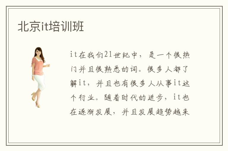 it在我们21世纪中,是一个很热门并且很熟悉的词。很多人都了解it,并且也有很多人从事it这个行业。随着时代的进步,it也在逐渐发展,并且发展趋势越来越快。所以有很多人想学习it,想要从事it行业。而北京作为我国的首都,在教育水平方面是相当优秀的,所以有很多同学前往北京it培训班进行专业知识的学习。而北京it培训也确实是全国一流的,很多名师都在北京。所以说,北京it培训是非常好的,同学们选择去北京it培训班是个不错的选择,因而在北京学it也是算是比较好的选择。并且,北京it培训技术这么好,所以有很多it培训机构都在北京。这让很多人选择培训班的时候有些无法下手,所以对于选择培训班的时候,很多同学束手无策。其实,选择培训班主要看其学习的内容,然后看自身情况,适合自己的就可以放心选择。在21世纪,很多领域都在迅速发展。正因为这些领域的发展,我们的生活才变得如此的美妙,丰富多彩的生活使我们享受生活。而it领域,就是在21世纪发展起来的领域。正因为如此,it行业的人才也在迅速增长,很多人都想从事it这个行业。而北京作为我国的首都,其教育水平是非常好的,北京it培训水平也是相当高的。所以很多人选择去北京it培训班进行it培训。而北京it培训水平这么高,很多人就有疑问了,北京it培训班学费是不是好贵。毕竟这么高水平的教育,学费也会随之增加好多。其实,北京it培训班学费并不会很贵相对于其它地方的培训机构。大概费用就在2万元左右。所以同学们在选择培训学校的时候,可以不用担心。而在选择学校的时候,也不要过多的在乎培训学校的学费。因为学费只是一时的,而学到的知识是一辈子的。在21世纪,电脑已经成为家家必备的产品。所以我们掌握电脑相关知识,也是时代进步的结果。而也有很多人对于电脑知识一窍不通,或者是对于电脑想要更加深入的学习。所以这些人会选择培训学校学习电脑知识。很大一部分选择去北京电脑学校培训电脑相关知识,因为北京电脑培训水平是很不错的。正因为北京电脑培训水平不错,所以很多想要去北京it培训班的人都有一个首要的问题,那就是北京it培训班学费怎么样,会不会好贵。其实,在北京,电脑培训学校并不会很贵。因为北京it培训班有很多,所以收费标准也是基本上很统一。而这么多人去北京电脑学校学习,究竟北京电脑培训怎么样呢。首先北京作为我国一线城市,它的教育水平在全国是数一数二的,其次很多公司都设立在北京,所以北京电脑学校相关业务也是比较饱和的。总之,北京it培训班还是很不错的。