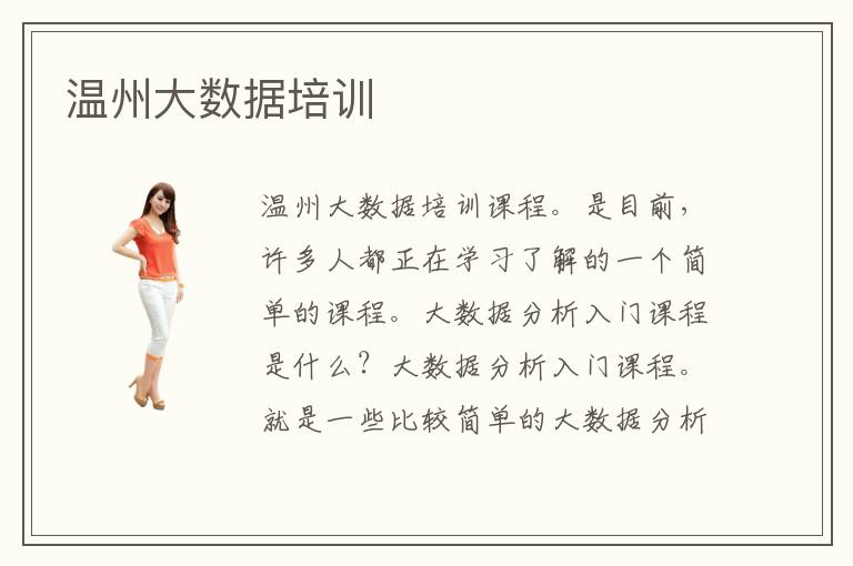 温州大数据培训大数据培训课程。是目前,许多人都正在学习了解的一个简单的课程。大数据分析入门课程是什么?大数据分析入门课程。就是一些比较简单的大数据分析方面的知识。比较适合,没有学习过大数据分析技术的人员,来进行学习。温州大数据培训课程,可以给,这些没有学习大数据分析技术的人,一个了解大数据分析技术的机会。从而更深入的学习大数据分析这门技术。温州大数据培训课程都是一些,比较专业的关于大数据分析技术的课程。大数据分析入门 学习课程。可以让许多的学习大数据分析技术的,人员,更专业的学会大数据分析技术。温州大数据培训课程都比较多,简单易懂。学习起来温州大数据培训课程非常的,轻松一些,并不吃力温州大数据培训的目的是什么?温州大数据培训的目的,很简单,无非就是,让想要学习大数据分析技术的人员,学到专业的知识。才能有机会成为大数据分析技术型人才。温州大数据培训的内容,都是些浅显易懂的相关大数据分析技术的知温州大数据培训课程都是什么识。经过温州大数据培训,学会大数据分析技术,是个好的办法。温州大数据培训,可以加快学习大数据分析技术的脚步。为什么说要快点学会大数据分析技术,是因为从事大数据分析行业,工资待遇都会不错的,而且升职机会,会比较的多。逐渐的许多人,都知道这些好处,都在学习大数据分析技术。所以,你才要通过温州大数据培训,更快的学到大数据分析技术。减少竞争的压力。更好的在这个社会上面生存下去。温州大数据培训会用,独特的方法,来让学员们,用最短的时间,学到,大数据分析技术。温州大数据培训真的可以学到,大数据分析技术的。温州大数据培训,可以把每一位学习大数据分析技术的,学员培训成专业的人才。温州大数据培训有着非常多的,培训经验。通过温州大数据培训,学习大数据分析技术。可以省下不少的时间了。温州大数据培训。培训的都是,专业的,大数据分析技术。有的学员可能会,跟不上学习的进度。但是通过温州大数据培训,就可以跟着上学习的进度。因为每个学员都会有不同的学习计划。从而,都能学会大数据分析技术。学会大数据分析技术,这一点是比较重要的。在温州大数据培训。就可以学会大数据分析技术。