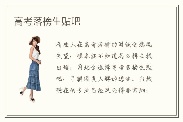 有些人在高考落榜的时候会悲观失望,根本就不知道怎么样去找出路,因此会选择高考落榜生贴吧,了解同类人群的想法。当然现在的专业已经风化得非常细,大家在继续就读的时候还是要找到适合专业类型,或者是多多关注自身的兴趣爱好。虽然没有考到好的学校,但是只要找到适合自己的专业,其实在任何地方都会有发亮的时候。高考落榜生贴吧有没有,高考落榜生的贴吧,往往会有非常多交流的经验,大家如果有同样的情况,可以到这些地方了解大家的想法,这样也可以适当排解自己的情绪。要知道这不是一个人的事情,高考落榜还有很多人也一样。高考落榜生贴吧哪些好,其实高考落榜贴吧也会介绍一些出路的问题,有一些人会选择到国外读书,可以学习外语,更加适应以后的全球化趋势。