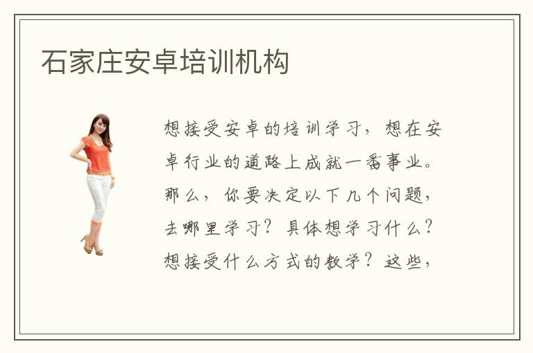想接受安卓的培训学习,想在安卓行业的道路上成就一番事业。那么,你要决定以下几个问题,去哪里学习?具体想学习什么?想接受什么方式的教学?这些,都可以有你决定。石家庄的安卓培训机构我们已经进行了逐一介绍,在哪,有什么,什么好,各个方面都是关键。同时,你的心也是极为重要的。我们总爱说,follow your heart,那么请您在选择上,依然遵循如此。
