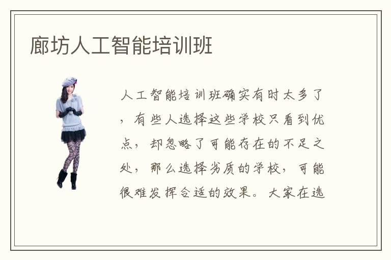 人工智能培训班确实有时太多了,有些人选择这些学校只看到优点,却忽略了可能存在的不足之处,那么选择劣质的学校,可能很难发挥合适的效果。大家在选择培训班的过程中,要尤为关心那个培训班的教学成果,老师的水平,专业的难度等等。廊坊人工智能培训班水平往往直接决定学生的教学质量,要是培训水平都不是特别高,那么学校的教学质量也会非常受人质疑。因此大家在选择人工智能学校的时候,要尽可能关注教学的经验,教学模式,师资力量等等。廊坊人工智能培训班难度如何,很多培训班的难度都很小,老师的经验也不会太少你能够针对各种不同的学生问题进行弥补。廊坊人工智能培训班技术高不高,培训班的技术还是比较高的,更加注重实践和理论的结合,并不像传统的学校照本宣科。