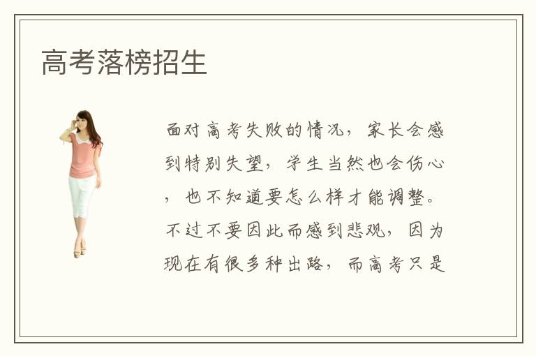 面对高考失败的情况,家长会感到特别失望,学生当然也会伤心,也不知道要怎么样才能调整。不过不要因此而感到悲观,因为现在有很多种出路,而高考只是其中一种。高考落榜招生要不要出国,高考落榜之后,如果条件还是不错的,可以选择好的大学,但前提是要找到自己的专业,如果学习不感兴趣的专业类型,确实在学习过程中会很容易感到痛苦,不容易坚持。高考落榜招生大专还浪费时间吗,要知道大专不是浪费时间,有高中生毕业之后是觉得自己的分数不太理想,因此就放弃去上学,马上到社会工作。不能想象的是,高中毕业生找到的都是比较劣质的工作类型,薪资待遇不高,都处于基层的状态。需要知道的是,自己才20岁,却要做这些劣质的工作,也许未来就能定型,固步自封在此。