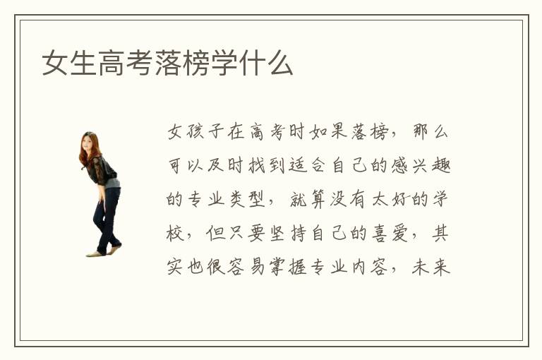 女孩子在高考时如果落榜,那么可以及时找到适合自己的感兴趣的专业类型,就算没有太好的学校,但只要坚持自己的喜爱,其实也很容易掌握专业内容,未来就业或者是创造知识的时候,往往拥有更好优势,达到更好水平。女生高考落榜学什么哪些专业好就业,要想找到比较好就业的专业,其实可以看一下整体社会的发展趋势,比如电子计算机或者是设计专业自媒体网络的呢。女生高考落榜学什么发展前景,女生高考落榜之后,可以考虑一下调剂,看一下能不能够调到本科的分数线。如果觉得自己的成绩还不错,或者是发挥失常,可以到复读的专业学校,再一次考试。不过每个人的水平都不一样,耐力和意志力等等都不相同,所以要想进行第二次高考,还是要做好充分的准备,避免未来承受不了压力,而浪费一年的时间。