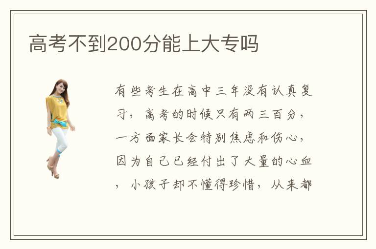 有些考生在高中三年没有认真复习,高考的时候只有两三百分,一方面家长会特别焦虑和伤心,因为自己已经付出了大量的心血,小孩子却不懂得珍惜,从来都不认真学习。高考不到200分能上大专吗要不要出国呢,高考200分基本上在国内完全可以和大学说再见,但如果外语能力比较好,申请国外的学校,也许拥有更强的优势,那么也能报读更加优秀的大学。高考不到200分能上大专吗专业优势,高考不到200分也可以达到大专的水平,有些人可能觉得分数比较低,因此学习大专是没有机会了。其实大专也是有很多的,质量参差不齐,专业优势也不同。大家可以重点关注专业优势更明显,排名更靠前的大专类型,这些学校往往拥有更好的资历,教学条件优越,学生吸收会更快,也能保证就业的优势。