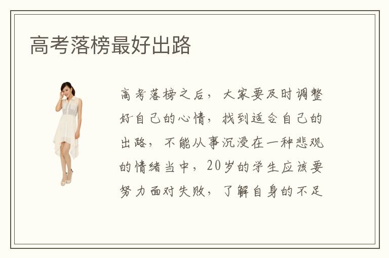 高考落榜之后,大家要及时调整好自己的心情,找到适合自己的出路,不能从事沉浸在一种悲观的情绪当中,20岁的学生应该要努力面对失败,了解自身的不足,进行适当的弥补,才能够减少损失。高考落榜最好出路可不可以重新考一次,高考落榜之后如果不是特别甘心,觉得还有很多力量没有发挥出来,想要更加突破自己的实力,不妨就给自己一次机会,一次接触名牌大学的机会,也许通过多年的努力,会达到自己胜利的彼岸。高考落榜最好出路要不要工作,高考落榜之后找工作其实是必中不明智的选择,因为现在基本上所有高薪水的工作都需要一定的专业技术,要是只有高考的文凭,就算短时间内能够找到工作,那未来很可能会被人超越,又没有任何专业优势,必然会面临着短时间内失业的风险。