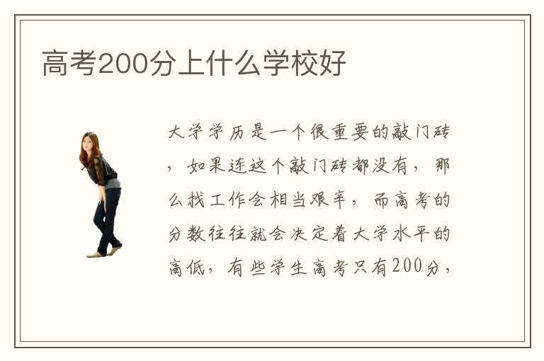 大学学历是一个很重要的敲门砖,如果连这个敲门砖都没有,那么找工作会相当艰辛,而高考的分数往往就会决定着大学水平的高低,有些学生高考只有200分,这是在找学校方面处于很被动的形式。高考200分上什么学校好专科怎么样,这一般不要只考虑学校的排名,更重要的是专业的排名,专业水平是比较高,培养的效果更好,那未来可以做专升本的准备。高考200分上什么学校好可以读本科吗,由于我国的高考分数线是按份划分的,所以并不是所有省份的本科线都一样,大家可以根据自身所在的地区来判断。大多数高考的分数线都是五百左右才能够读本科,高考只有200分的话,可以选择国内比较知名的大专院校和高职院校,也是有不错的专业能力,培养很多专业的人才,为社会贡献自身力量。