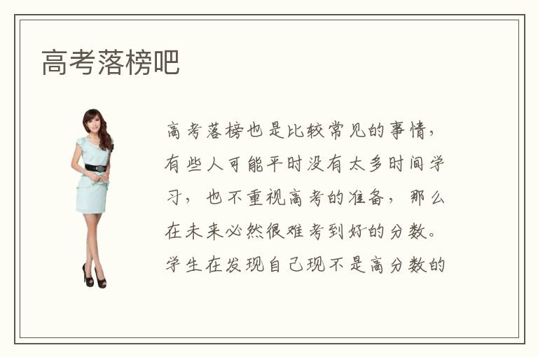 高考落榜也是比较常见的事情,有些人可能平时没有太多时间学习,也不重视高考的准备,那么在未来必然很难考到好的分数。学生在发现自己现不是高分数的时候,不能够太失望,及时找到调整的方法,或者是有些人会选择到国外读书等等,尽可能找到适合自己的前途。高考落榜吧怎么找学校,高考落榜了要找专科院校,可以到当地实地了解一下每个学校的资历以及环境情况,针对自己的需求来选择,不要经常觉得大专学校就比较不好,其实有些高端的专业学校往往比大学会好很多。高考落榜吧要不要继续读下去,高考落榜比较容易让人丧失信心,但大家要调整过来,这些考试只是其中的一个方面,还有很多考试在未来等着我们,人生就是起起伏伏,大家要从长远的角度看,这样才会更加舒心。