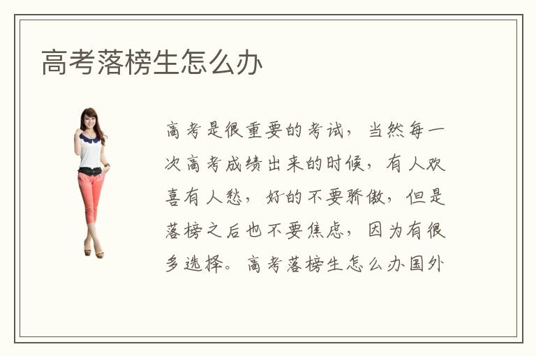 高考是很重要的考试,当然每一次高考成绩出来的时候,有人欢喜有人愁,好的不要骄傲,但是落榜之后也不要焦虑,因为有很多选择。高考落榜生怎么办国外学校,高考落榜生可以申请到国外的大学留学,但大家要记得做好充分准备,因为当地的语言以及文化背景,每个人的生活习惯都不一样,要花比较长的一段时间时间。高考落榜生怎么办心情不好,高考落榜生难免会有一点心情不好,但这些都是要调理好,其实偶尔给自己心情不好的时间和反省的时间,其实也是自己成长的非常重要的一部分。另外不要太过于伤心,要相信阳光总在风雨后,历史上的成功人物都有无数的失败,也是众人只看到他的一次成功,但人前显贵,背后受罪。想得到更好的成绩,应该通过更强大的努力,为整个社会提供更有用的价值。