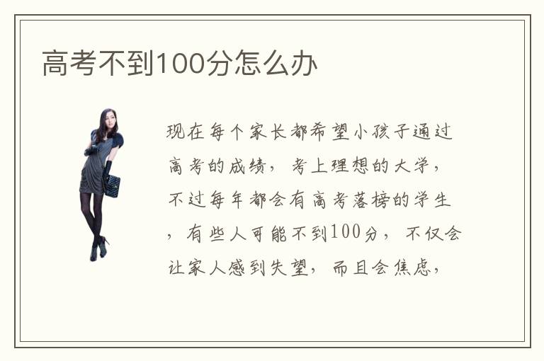 现在每个家长都希望小孩子通过高考的成绩,考上理想的大学,不过每年都会有高考落榜的学生,有些人可能不到100分,不仅会让家人感到失望,而且会焦虑,害怕小孩子的前途一片黑暗。高考不到100分怎么办大专含金量如何,高考不到100分,可能只能选择劣质的大专院校,当然不要太担心,还是有大专院校门槛较低,含金量必然不会太高,但只要掌握专业水平,其实走到哪里都是金子。高考不到100分怎么办专业优势是什么,高考不到100分其实是不太可能的,要是觉得分数有点疑问,可以到高考的查分机构咨询一下,申请重新查分,看看是否真的如此。还可找专业优势比较好的学校,有些学校确实拥有不错水准,教学经验丰富,也采用更加先进的操作方式,让学生拥有比较好的水平,改善自身的能力不足。