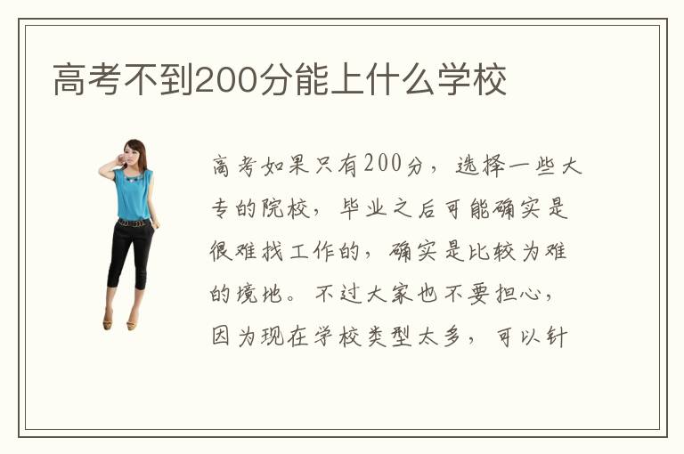 高考如果只有200分,选择一些大专的院校,毕业之后可能确实是很难找工作的,确实是比较为难的境地。不过大家也不要担心,因为现在学校类型太多,可以针对自己的兴趣找一些好一点的专业学校和大专,发挥自身的优势。高考不到200分能上什么学校有必要读吗,这次不管考到多少分,都不用担心没有书读,因为很多专业院校的门槛都比较低。高考不到200分能上什么学校好不好,一般是选择大专和技校,高职院校,很多人都担心才200分左右,没有任何学校可以选择。但大家也不要紧张,现在大专学校确实太多了,基本上只要完成了高考,拿到高考毕业证,到另外一所大专学习是非常简单的,入学门槛并不高。但大家在考到200分以后,要吸取教训,不要总是懈怠,浪费时间,还是要抓紧机遇,改善自身的不足。