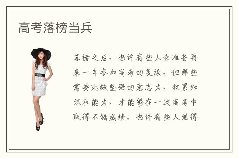 落榜之后,也许有些人会准备再来一年参加高考的复读,但那些需要比较坚强的意志力,积累知识和能力,才能够在一次高考中取得不错成绩。也许有些人觉得再来一年自己的经验变得更加丰富,也能更加深入了解基本的知识,就不努力学习,这其实是大的误区。高考落榜当兵可不可以专升本,落榜之后当兵当然可以专升本,大家如果有这样的意志力,想要进行本科学习,那么就要不断努力深化理论知识,在学校中拥有更好表现。高考落榜当兵苦不苦,高考落榜当兵当然会比较辛苦,当然要跟个人平时的意志力,素质以及身体的健康状态有关系,有些人从小到大都有非常强壮的身体,意志力也非常不错,能够听从教练的课和训练,往往可以发挥非常好的优势,当兵的素质变得更高,还能够继续深造。