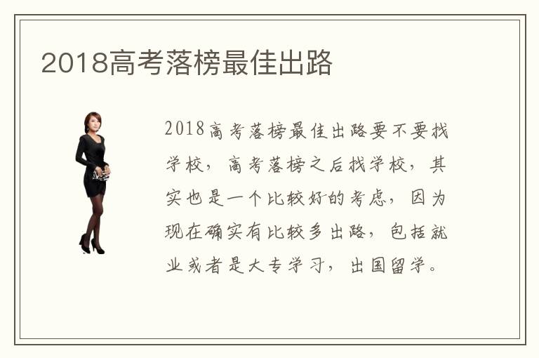 2018高考落榜高考落榜最佳出路要不要找学校,高考落榜之后找学校,其实也是一个比较好的考虑,因为现在确实有比较多出路,包括就业或者是大专学习,出国留学。而如果选择比较好的大专学校,其实也能够培养学生的动手和专业能力。如果专业能力比较强的情况下,可以在工作两年之后继续深造,专升本或者考研。2018高考落榜最佳出路出去工作吗,其实有些人是由于没有考到好成绩,到社会工作,这其实也不是不可以。由于现在的高考后毕业之后文凭是非常低的,根本就没有办法达到工作的门槛,甚至也没有办法到更加大的舞台和公司,所以是真的不要考虑马上工作。不管选择哪一种出路,大家还是要看一下自己的能力,不断加强努力,只要选择的道路坚持下去,总有一天可以到达成功的彼岸。