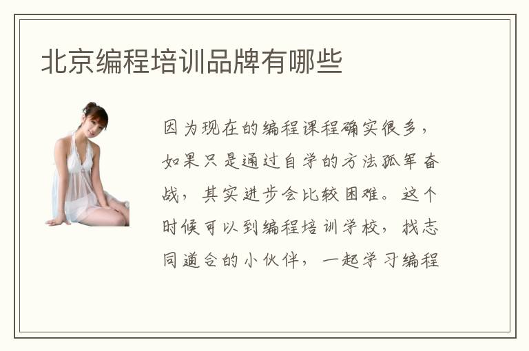因为现在的编程课程确实很多,如果只是通过自学的方法孤军奋战,其实进步会比较困难。这个时候可以到编程培训学校,找志同道合的小伙伴,一起学习编程的内容,也许可以得到更高的成绩和更长远进步,而且也会相互交流,效率更高,学习更有乐趣。北京编程培训品牌有哪些,可以考虑排名靠前、口碑更好的编程培训机构。这些机构拥有不错水准,那么口碑才可以得到更多学生的肯定。如果排名不算靠前,可能是由于教学成果或者是质量方面,不能够在同行中脱颖而出。北京编程培训品牌有哪些靠谱,如果能找到优质的培训机构老师,其实效率会更高,培训编程专业的成果会更好。北京编程培训品牌特点是有更强的效应,专业能力强,服务质量更加优越,因此为学生提供满意的课程解答。