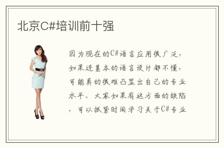 因为现在的C#语言应用很广泛,如果连基本的语言设计都不懂,可能真的很难凸显出自己的专业水平。大家如果有这方面的缺陷,可以抓紧时间学习关于C#专业知识,但也可以多多对比北京C#培训前十强,找到合适的机构,在C#培训老师的帮助之后,也许进步会更加突出。北京C#培训前十强老师怎么样,一般C#培训机构要求更多有经验的老师,才能够将复杂的枯燥无味的知识讲解得更加生动。毕竟那些关于C#专业数据的知识内容,如果没有非常浓厚的兴趣很难学习和掌握。北京C#培训前十强能力强,如果培训机构排名靠前,那么说明实力的更强,也能与时俱进,根据每个C#专业学生的能力来培养,也能尊重学生的兴趣以及基本的学习进度来培养,让学生可以以自己的节奏来学习。