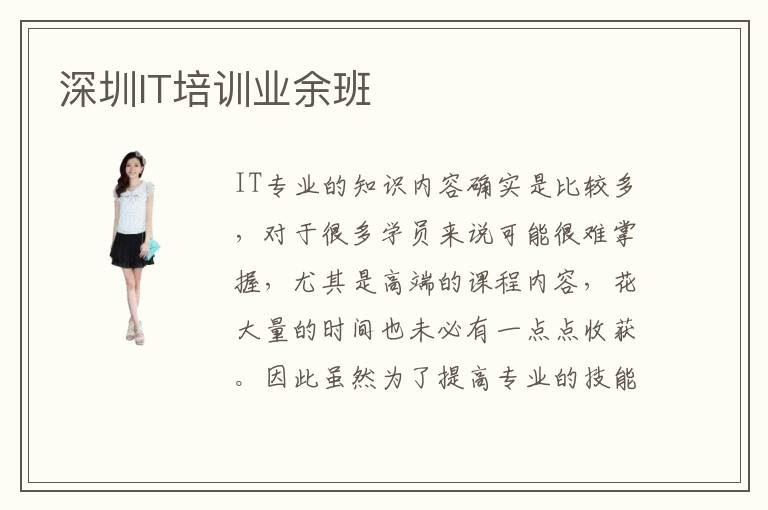 IT专业的知识内容确实是比较多,对于很多学员来说可能很难掌握,尤其是高端的课程内容,花大量的时间也未必有一点点收获。因此虽然为了提高专业的技能,优化培养的方案,可以考虑深圳IT培训业余班,这些机构往往拥有更强的优势,管理水平高,也能为专业人员带来更加优异的成果。深圳IT培训业余班资源往往很齐备,教学成果也比较突出,有些专业机构可能没有很好的教学质量和教学能力,因此发挥出来的IT培训成果确实很令人担忧。深圳IT培训业余班要不要选择,如果平常想要学习更多高端的课程,那么IT课程培训业余班也许是更加优质的考虑。有些培训班往往拥有不错的特色,教学资源丰富,也能满足大多数专业爱好者的发展需要。不过也有部分培训班,连基本的设备和教育资源都没有,成果是很难凸显的。