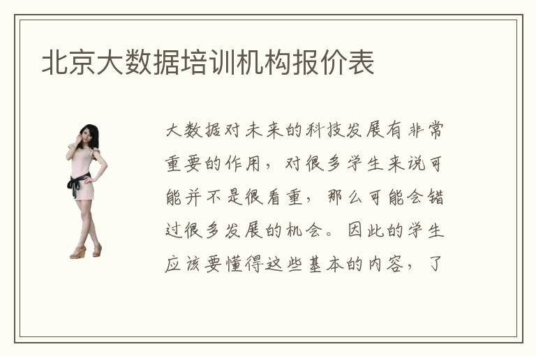 大数据对未来的科技发展有非常重要的作用,对很多学生来说可能并不是很看重,那么可能会错过很多发展的机会。因此的学生应该要懂得这些基本的内容,了解大数据的正确应用以及知识的积累。但如果觉得平时比较忙,不知道怎么样进步,可以考虑专业的大数据培训班,这些班级往往可以提供更全面的科学内容,让学生可以有更加全面的知识提升。北京大数据培训大数据培训机构报价表,可能在2000元到5500元,但也有部分是例外,主要是课程内容不太一致。北京大数据培训机构报价表如何考虑,有些学生可能觉得1对1的效果比较好,因此会选择这些课程方案,前期的学习成果比较好,但是可能的报名费会上涨。北京大数据培训机构报价表影响因素要看各种培训的内容、培训时间和方法,因为1对1的课程项目以及高级的培训项目是不一样的。