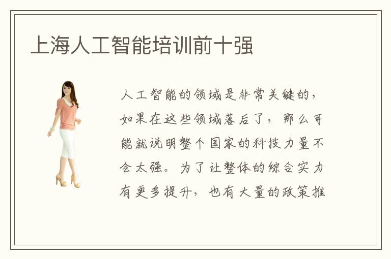 人工智能的领域是非常关键的,如果在这些领域落后了,那么可能就说明整个国家的科技力量不会太强。为了让整体的综合实力有更多提升,也有大量的政策推出,鼓励人们学习人工智能的知识。而有些计算机专业的学生也想方设法改善自己在人工智能应用方面的能力,因此想要找到上海人工智能培训前十强,在专业人工智能培训导师的帮助下,优化自身的应用力量。上海人工智能培训前十强合不合适,人工智能培训机构排名靠前的情况下,往往说明这些机构拥有不错的专业水准,教学优势突出,辅导老师的能力高,学生的成绩也是很好的。上海人工智能培训前十强如何挑选,要看课程质量、基本的口碑,每一年的教学成绩等等。因为有些人工智能培训机构的老师确实是很厉害,因此每一年的教学成绩都非常抢眼,确实值得学生选择。