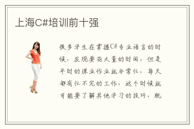 很多学生在掌握C#专业语言的时候,发现要花大量的时间,但是平时的课业作业就非常忙,每天都有忙不完的工作,这个时候就可能要了解其他学习的技巧,既能够保证学习的效率,又可以巩固其他知识的内容。如果大家缺乏这方面的经验,可以考虑上海C#培训前十强,通常这些专业的机构都会有强劲的优势,也能提高学生学习速度,在专业领域方面得到更加深入的认识,巩固学生知识结构。上海C#培训前十强水平通常都是比较高的,大多数都有不错的质量,管理模式也相当值得期待。有些学生可能平常缺乏C#专业内容了解,但是通过专业培训指导的帮助,就能够优化技能,取得更加优异的发展成绩。上海C#培训前十强哪些合适,如果没有太多经验或者是没有时间学习,可以通过培训班的帮忙,提高学习的效率,舒缓学习的压力。