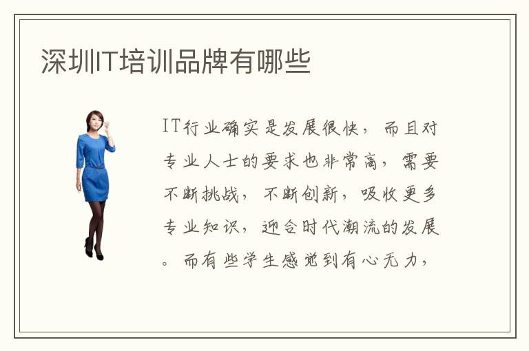 IT行业确实是发展很快,而且对专业人士的要求也非常高,需要不断挑战,不断创新,吸收更多专业知识,迎合时代潮流的发展。而有些学生感觉到有心无力,虽然自己已经花了很多时间投入在IT行业学习当中,但是见效很少,那么很可能就是由于方法没有找对,或者是没有选择专业的IT培训品牌机构。大家可以参考深圳IT培训品牌有哪些,找到合适的机构,提升专业能力和应用水准。深圳IT培训品牌有哪些好,通常IT培训品牌比较优质的学校都有不错的教育水准,专业能力强,对学生的应用能力有非常高的保障。深圳IT培训品牌有哪些靠谱,要是学校可以与时俱进,不断创新科学的培训内容,而且也想方设法让学生掌握更多专业的知识技术和前沿领域的知识,那么往往会有更加明显的优势,更值得大家考虑和选择。