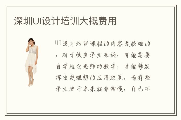 UI设计培训课程的内容是较难的,对于很多学生来说,可能需要自学结合老师的教学,才能够发挥出更理想的应用效果。而有些学生学习本来就非常慢,自己不能够独当一面,掌握更多先进的知识内容,那么可以多多关注深圳UI设计培训大概费用,了解大概的教学培训方案和教学机构,也许可以取得更明显UI设计的培训优势。深圳UI设计培训大概费用怎么样,可能是花3000元到15000元,不过也机构在培养方案方面以及课程内容设置方面有很大的差异,因此不可以只是关注大概的数字,还要多了解教学的质量、培养成果等等。深圳UI设计培训大概费用大概多少,有些学生的条件比较好,想要找高端的课程服务项目,也选择1对1的指导,那么这些学生可以得到全面的知识体系培训,而且效率高得多,收费也会随着上升。