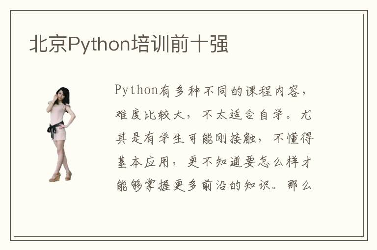Python有多种不同的课程内容,难度比较大,不太适合自学。尤其是有学生可能刚接触,不懂得基本应用,更不知道要怎么样才能够掌握更多前沿的知识。那么大家可以先了解北京Python培训前十强找到专业的机构,选择更好的培训课程内容,从而得到更好的提升。北京Python培训前十强好不好,北京Python培训的专业机构其实很多,大多数都是比较正规的,尤其是这些大城市的机构,往往有非常专业老师,师资力量雄厚,资源也更加集中,教育成果也会比较突出。北京Python培训前十强有哪些,其实大多数Python培训机构都有不错的优势,专业的水平高,但是也不排除部分Python培训机构没有很好的质量,老师水准低,也不能够针对每一位学生的需求来进行专业的Python培训,因此效果是很难凸显出来,可能还会浪费学生的时间。