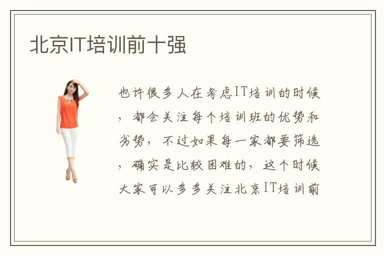 也许很多人在考虑IT培训的时候,都会关注每个培训班的优势和劣势,不过如果每一家都要筛选,确实是比较困难的,这个时候大家可以多多关注北京IT培训前十强,缩小选择的范围,那么也许可以提高寻找培训班的效率。北京IT培训前十强有哪些,通常IT培训前10强的机构都会有更加严谨的教学方案,师资力量更雄厚,而且也能针对每一位学生的IT专业应用和理解能力来进行培养,让学生可以赢在起跑线上。北京IT培训前十强排行榜一般都比较靠谱,可以让学生进步更快,也能更加了解整个行业的发展趋势和具体的应用。有些学生可能长期接触传统的学校教育,并不是特别关注真正的实际场合应用,那么发挥出来的效率就会低很多。但也不要担心培训机构会帮助各种学生解答这样的问题,也能更快应用到就业场合。