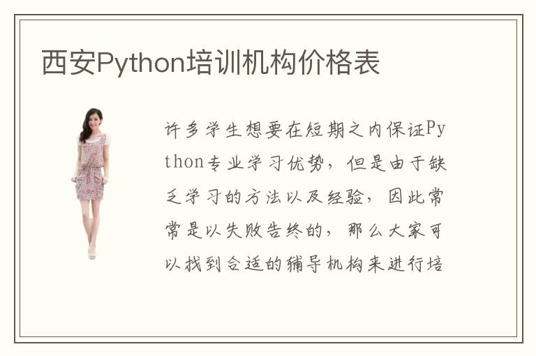 许多学生想要在短期之内保证Python专业学习优势,但是由于缺乏学习的方法以及经验,因此常常是以失败告终的,那么大家可以找到合适的辅导机构来进行培训。西安Python培训机构价格表可能要看教育质量和学习方法等等。有些Python培训机构学习动力更强,让学生的成果更加明显,那么报名费用是会提高的。Python培训机构选择方法首先要关注培训的质量、教学方法以及教学的成绩等等。虽然说有些辅导机构浪得虚名,没有专业的实际成果,但是如果能找到专业的辅导机构,那么往往学生的成绩会有更明显的以及快速的提升。另外不管选择哪些Python辅导机构,其实都应该要多关心自己的技术优势以及存在的缺陷,不要全盘否定。应该要及时针对自己的问题来进行解决,这样培训成果才会更加明显,而且效率也更高。