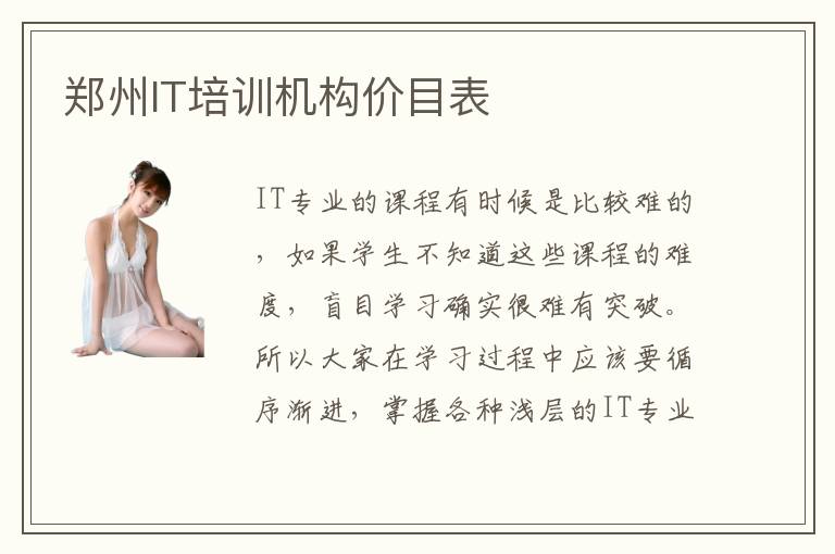 IT专业的课程有时候是比较难的,如果学生不知道这些课程的难度,盲目学习确实很难有突破。所以大家在学习过程中应该要循序渐进,掌握各种浅层的IT专业知识,再继续挑战更高难度的知识内容。而如果不知道如何布置这些规划,那么可以有多种专业的辅导机构和老师来进行制定,老师可以利用多年的工作经验和教学经验,让更多学生渐渐掌握IT专业的各种不同层面的知识。郑州IT培训机构价目表也许是3000~8900元,但是也有部分机构的课程并不是完全相同,因此并不能够保证所有价格都是一致的。IT培训机构水准如何,有时要看IT培训机构技术如果技术水平高,专业的程度强,可以结合当下的流行的IT专业知识来培养,那么往往就会有更强的技术教育成果优势,在应用方面也有更高的水准。