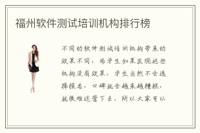 不同的软件测试培训机构带来的效果不同,而学生如果发现这些机构没有效果,学生当然不会选择报名,口碑就会越来越糟糕,就很难运营下去。所以大家可以先了解各种机构的口碑情况以及技术质量、教学的水平等等。福州软件测试培训机构排行榜,软件测试培训机构怎么考虑,一般情况下,学生在选择软件测试培训机构之前,都会特别关注培训内容以及学习费用,但是大家也要多多关注培训的资历以及培训的方法等等,有些学校确实是可以提供大量的培训资料,也一直在采用先进的辅导课程方法,让学生得到更加可观的成绩,因此优势也更加值得肯定。软件测试培训机构口碑其实大多数都能够保证的,因为现在软件测试培训机构的压力也比较大,主要就是有些学校可能并没有很好的技能,就是那么可能就会被学生淘汰。