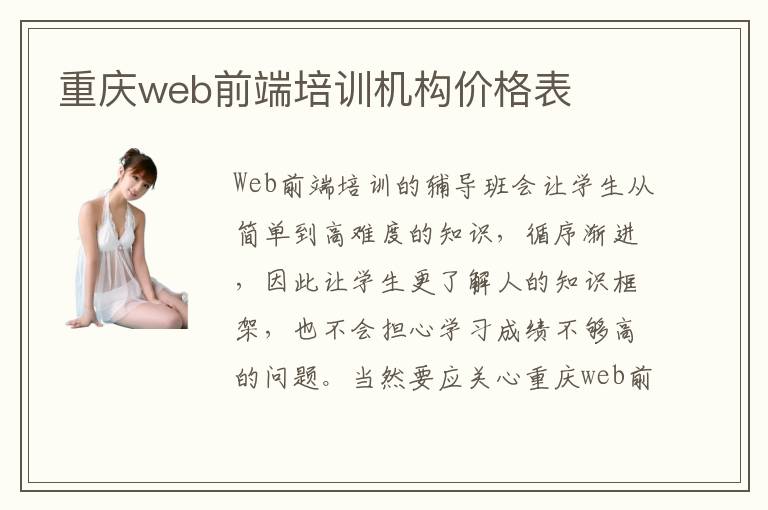 Web前端培训的辅导班会让学生从简单到高难度的知识,循序渐进,因此让学生更了解人的知识框架,也不会担心学习成绩不够高的问题。当然要应关心重庆web前端培训机构价格表,因为有些价格比较高的培训机构可能学生是难承担的,盲目报班会导致学习的压力比较大。web前端培训教学优势主要是改善web前端应用能力,提高技能优势,掌握更多知识内容。有些人可能平常没有应用的训练,导致学习的web前端知识内容发挥不出价值,但是如果有一系列应用之后,往往只能亲自动手去将各种理论的知识融入到实践中,也能改善未来的应用成绩和水平。web前端培训机构压力很大吗,目前的web前端专业竞争还是比较大的,所以有压力也很正常,但老师会制定轻松学习方案,让学生可以更加快速轻松掌握这些内容。